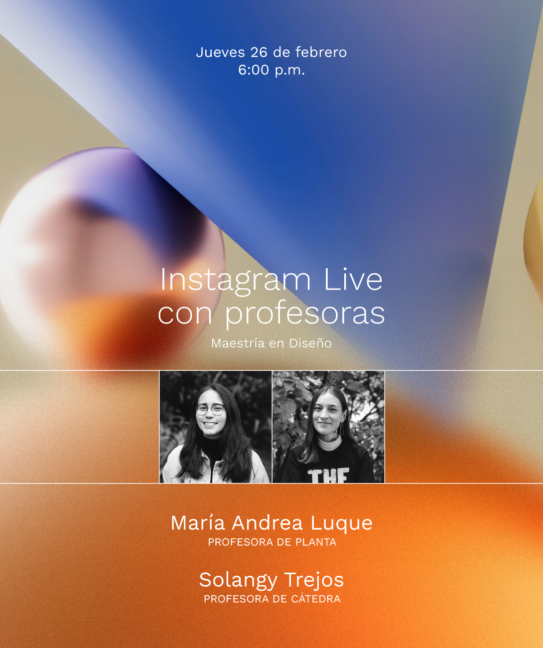 Hoy · 6:00 PM · Virtual Instagram Live con nuestras profesoras MDIS Solangy Trejos y María Andrea Luque Este 26 de febrero conéctate a este Instagram Live con nuestras profesoras MDIS María Andrea Luque y Solangy Trejos. Ver más