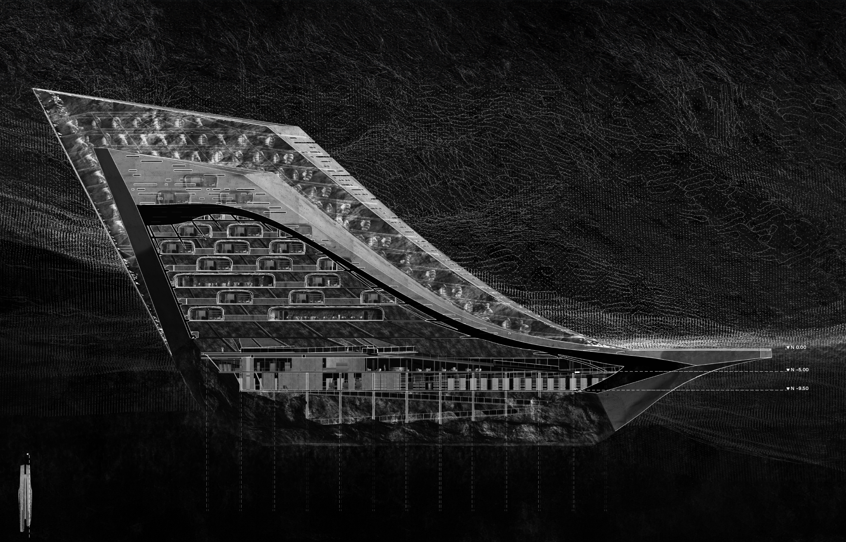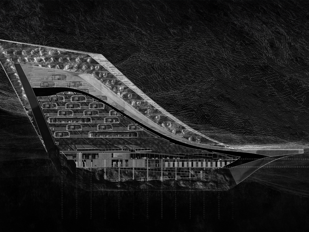 En el corazón de la vasta y helada Península Antártica, se erige Aether, un santuario de conexión celestial. Esta obra arquitectónica, rodeada por la inmensidad glaciar, busca reavivar el antiguo vínculo de la humanidad con el cielo nocturno. En su centro yace “La Grieta,” una hendidura simbólica y física que une lo terrenal con lo etéreo, invitando a los visitantes a trascender sus límites terrestres y conectar con el cosmos. Impulsado por un arreglo de turbinas eólicas, Aether representa la sostenibilidad, susurrando los secretos de las estrellas mientras armoniza con la naturaleza. Inspirado en la esencia mitológica del aire puro y divino, Aether es un faro que nos guía hacia el firmamento, recordándonos nuestra eterna fascinación por el universo y nuestra incansable búsqueda de conocimiento.