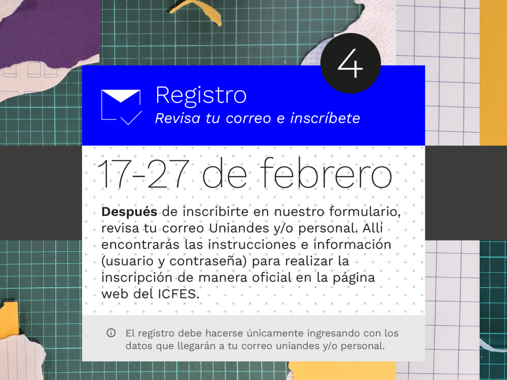 Después de inscribirte en nuestro formulario, revisa tu correo Uniandes y/o personal. Allí encontrarás las instrucciones e información (usuario y contraseña) para realizar la inscripción de manera oficial en la página web del ICFES.
