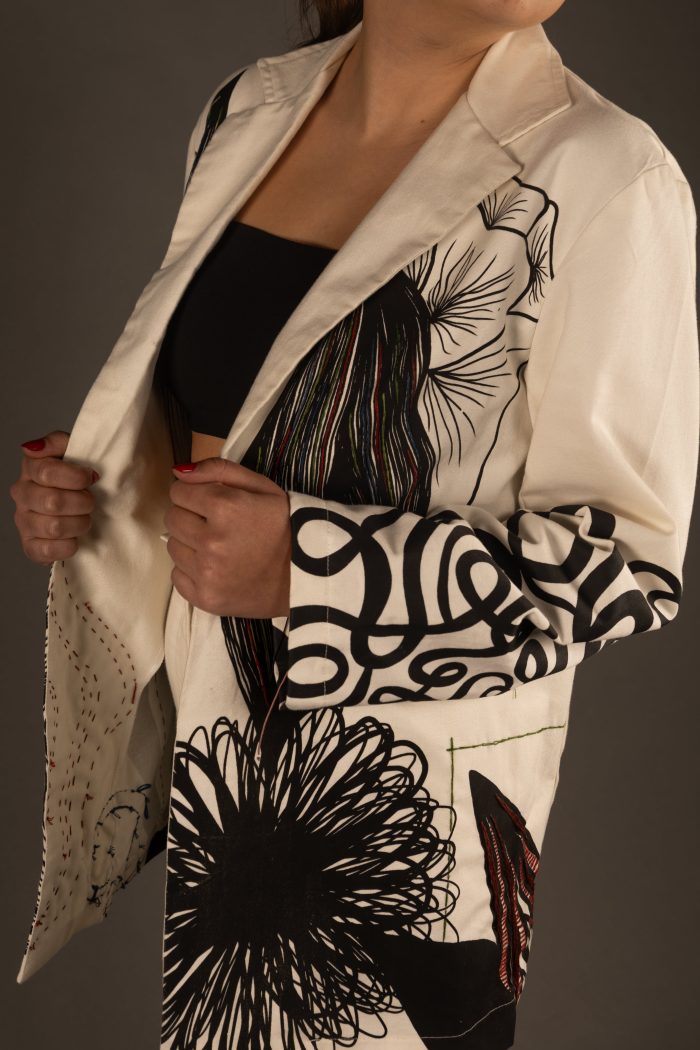Durante el aprendizaje de diferentes técnicas de estampación y de bordado, exploré la fascinante interacción entre dos extremos visuales en el entorno natural que se evidencia en las piezas de Karl Blossfeldt. El contraste entre lo fuerte y lo delicado, el blanco y negro y los acentos de color se convierte en una danza visual en la naturaleza que muestra cómo la fortaleza y la delicadeza pueden coexistir y complementarse en perfecta armonía. Cada uno de estos elementos desempeña un papel vital en la riqueza y la diversidad de nuestro mundo natural, creando una sinfonía visual que cautiva nuestros sentidos.