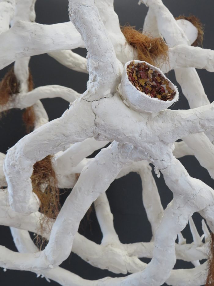 Este proyecto es una investigación de la materia a través de diversas exploraciones. Mediante la selección de cuatro materias por transformar, se empezaron a conocer sus capacidades y características de expresión. Seleccionamos escamas y hojas de la palma de moriche, yeso y pelo de mazorca. Para el final del proyecto se debía explorar con estos materiales la creación de unos artefactos que trascendieran la función. Así, se crearon dos piezas que dialogaran con el concepto planteado: incomodidad voraz. El proyecto se enmarcaba en las sensaciones relacionadas, y a través de estas piezas se comunicaron de manera plástica. En el nido angustiante, representamos la sensación de apresamiento de la psiquis, y en la otra pieza las direcciones diversas y simultáneas que se atraviesan en momentos de ansiedad. En resumen, los materiales nos hablaron y nosotros escuchamos para potenciar sus características y comunicar a través de ellas.