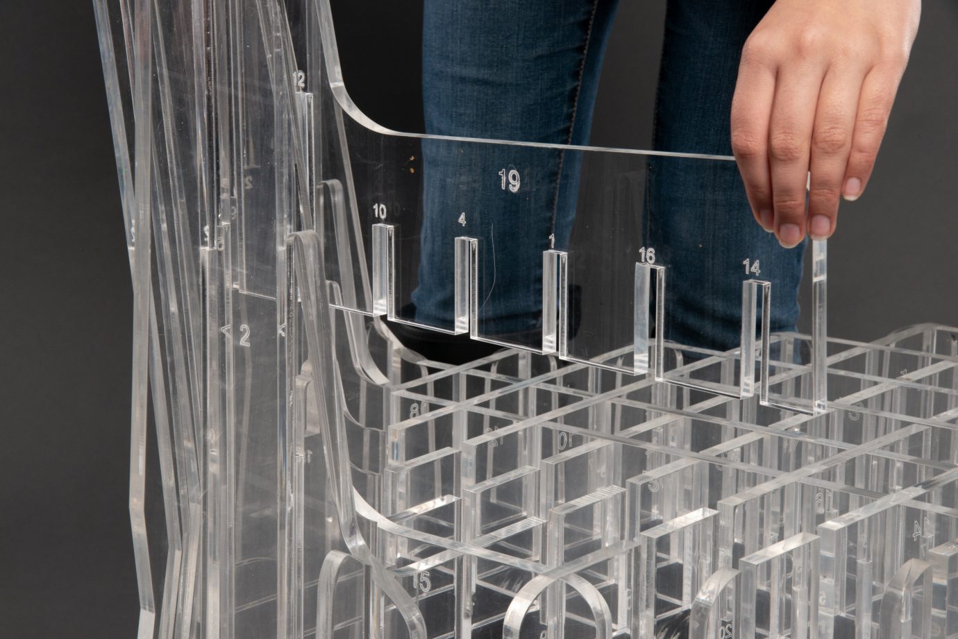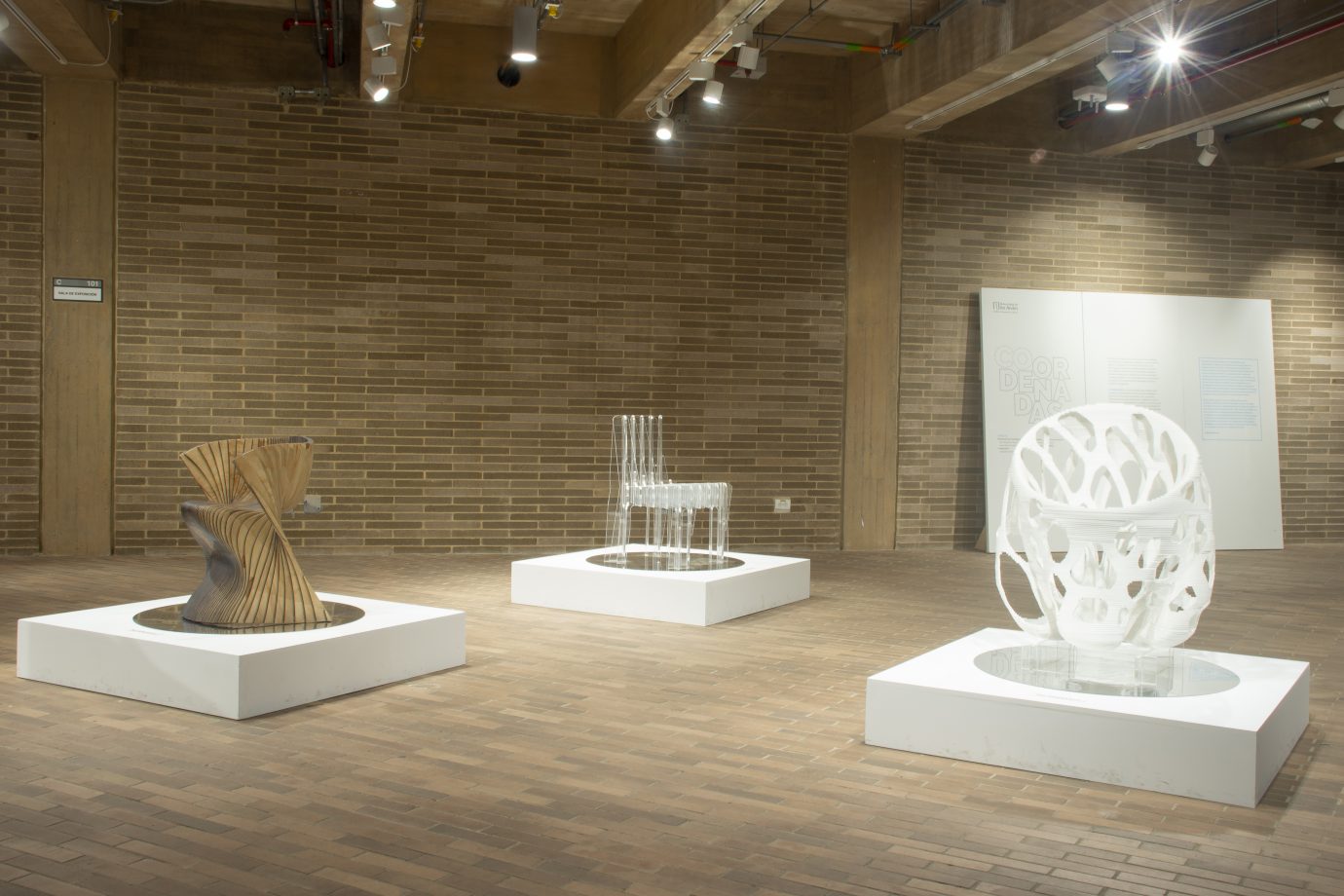 Coordenadas se vale del diseño paramétrico para estudiar las posibilidades de los procesos digitales y generar las tres piezas expuestas. Con un estudio detallado de las especificaciones, la definición de los materiales y su espacialidad, se planifica el camino para elaborar la forma. La materialización es el resultado de la combinación perfecta entre la reflexión del diseñador en el mundo análogo y el resultado de procesos digitales, que termina generando piezas codificadas para formar objetos.