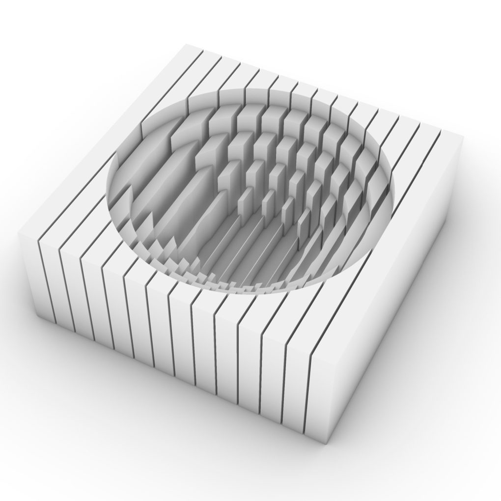 A partir de la obra Serigrafía 395001 del artista húngaro Victor Vasarely, y mediante el uso de herramientas digitales, se realiza una apropiación tridimensional del objeto. La obra fue influenciada por el movimiento de arte cinético, destacando siempre la geometría y los atributos físicos del color para lograr engaños perceptivos.