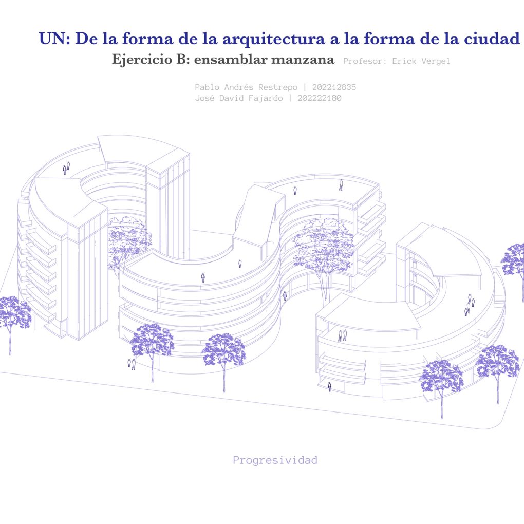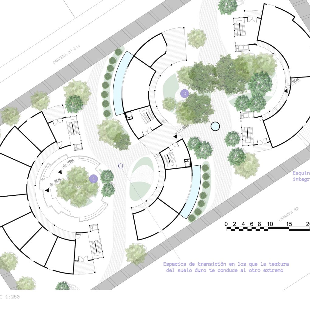 El proyecto busca, a partir de tres volúmenes, construir espacio público en una manzana ubicada entre las carreras 33 y 33 Bis, y la calle 25b. Se usan volúmenes construidos con base en una configuración radial para abarcar diferentes espacios en sus centros, permitiendo que se construya espacio público, a la vez que se protegen de cierta manera y se vuelven espacios seguros. El proyecto maneja el concepto de progresividad, ya que se va desde los espacios de uso más mayorista —como mercados y gimnasio— a pequeñas bibliotecas, bancos y pequeños comercios para el uso de los locales. El proyecto toma en cuenta la importancia de la 33, y es progresivo en alturas que van desde el barrio hasta la carrera 33, haciendo los volúmenes cada vez más grandes para continuar con las alturas que se mantienen en esta calle principal. El proyecto interviene desde una perspectiva de aumentar la permeabilidad de la manzana, haciendo puntos fijos transparentes y observables desde los exteriores y buscando construir una mejor ciudad desde el espacio público protegido.