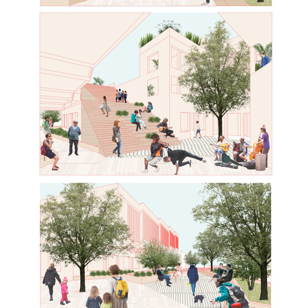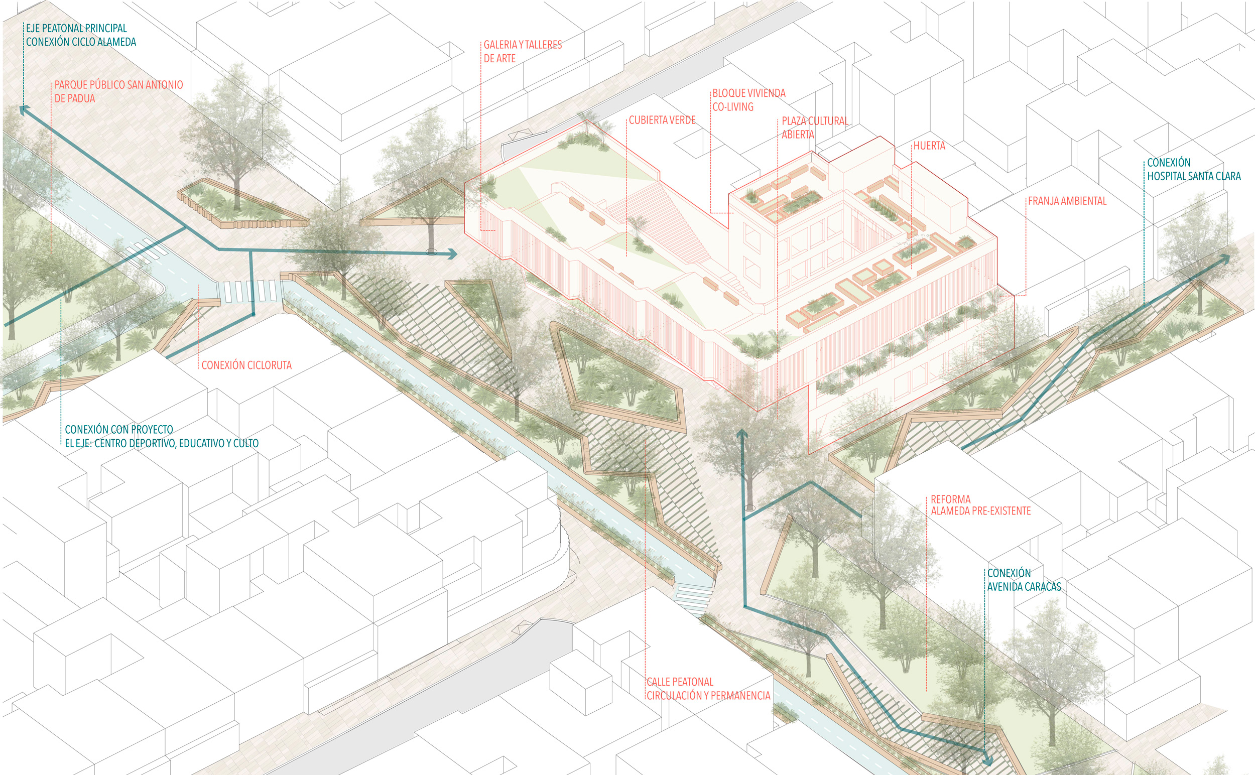 Finalmente, cabe resaltar la importancia del espacio público y del eje peatonal que teje el proyecto con el barrio. Es un espacio diverso para la comunidad, con conexión de ciclovía, espacios de permanencia y de tránsito, convirtiéndolo en un valioso atributo para el proyecto.