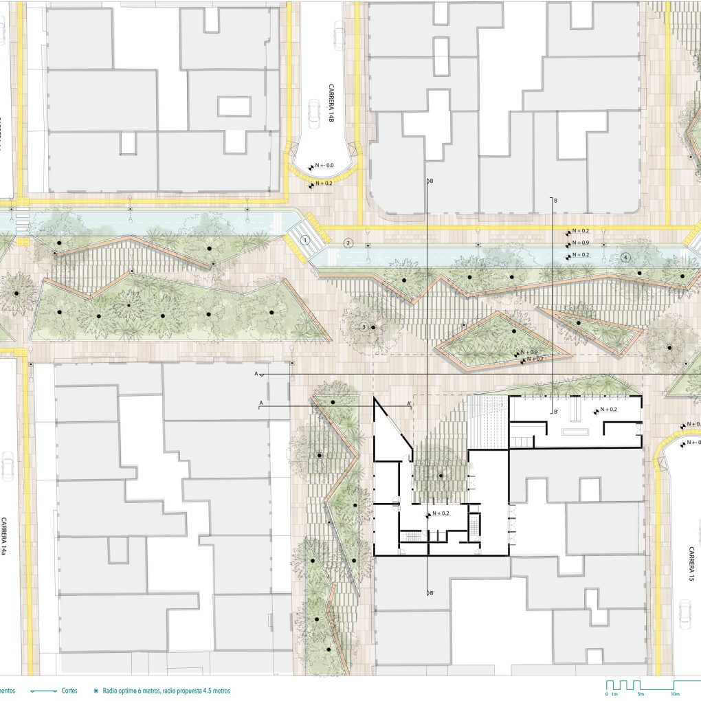 En términos de programa contamos con usos mixtos: galería de arte, teatro urbano, café, talleres, ludoteca y vivienda. Estos usos fueron pensados con el propósito de ofrecer lugares de reunión, actividades culturales, temporales y permanentes, para cada uno de los miembros de la comunidad, sin olvidar y reemplazar la vivienda.
