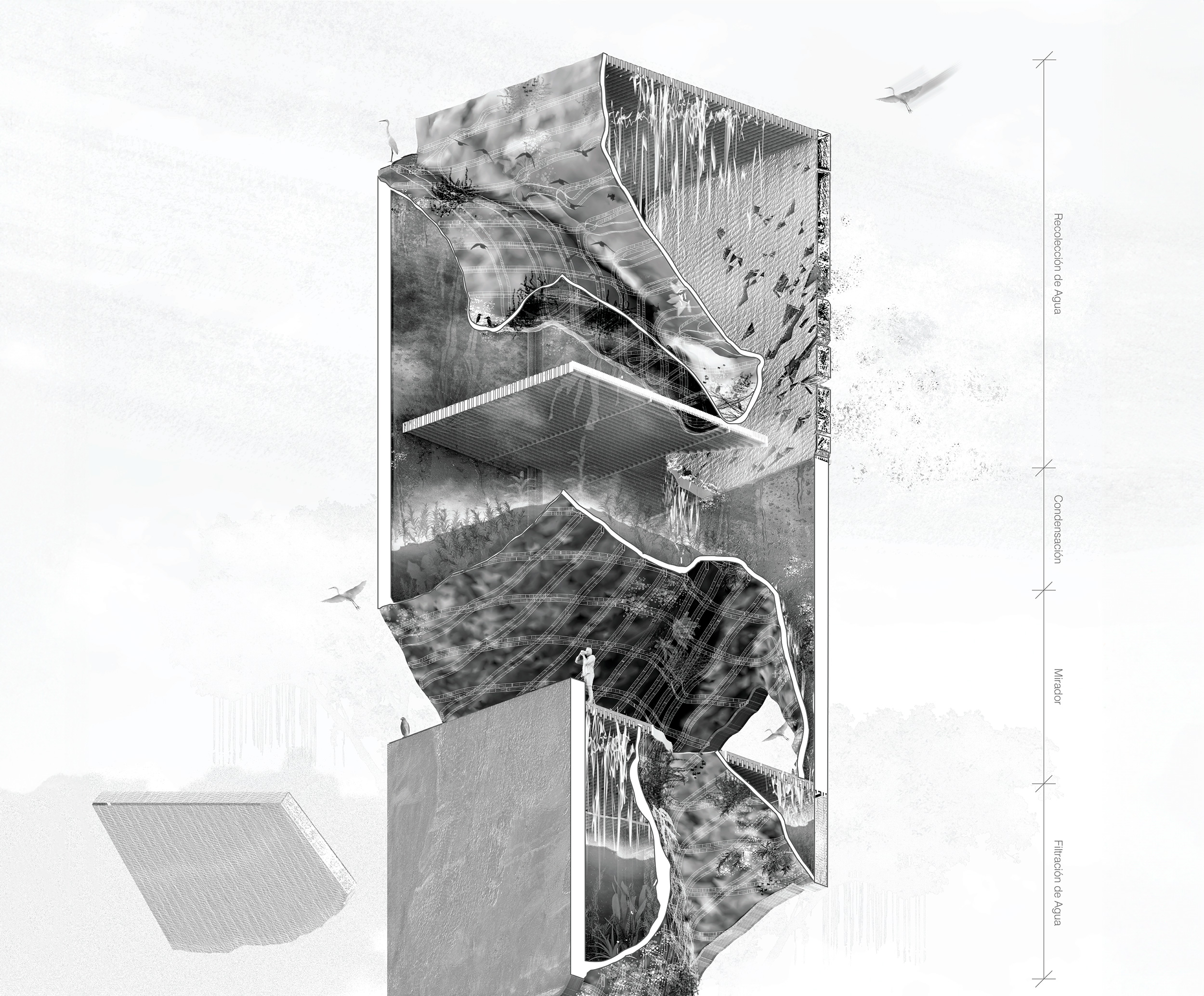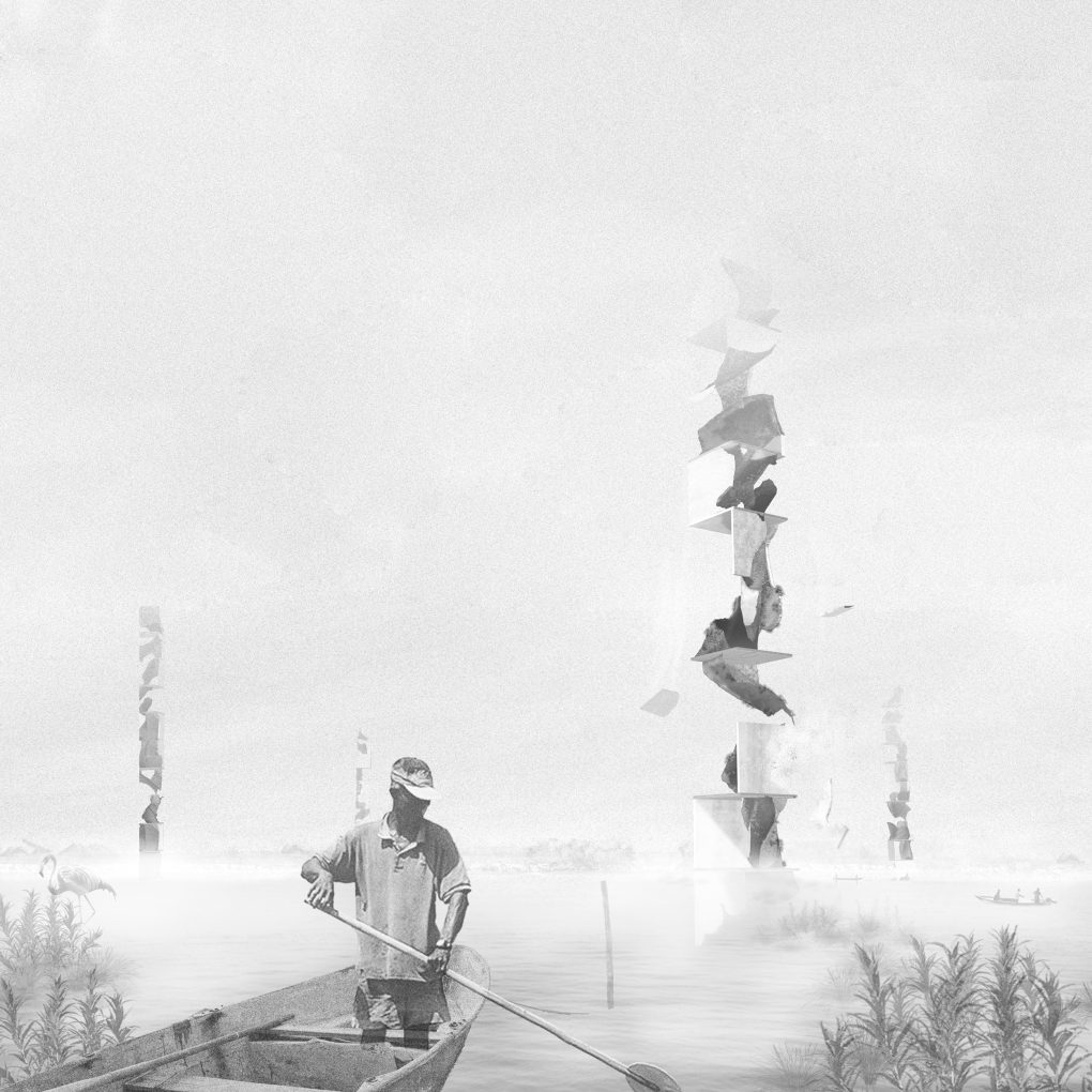 La pieza como artefacto se descompone para componer el paisaje, una excusa para contemplar los procesos ecosistémicos. El hiperartefacto captura agua desde su estado más efímero: el vapor. Se condensa en los reservorios verticales que progresivamente filtran el agua a través de sinuosas cavidades y tuberías lineales que brindan un recurso potable directo para los pescadores.