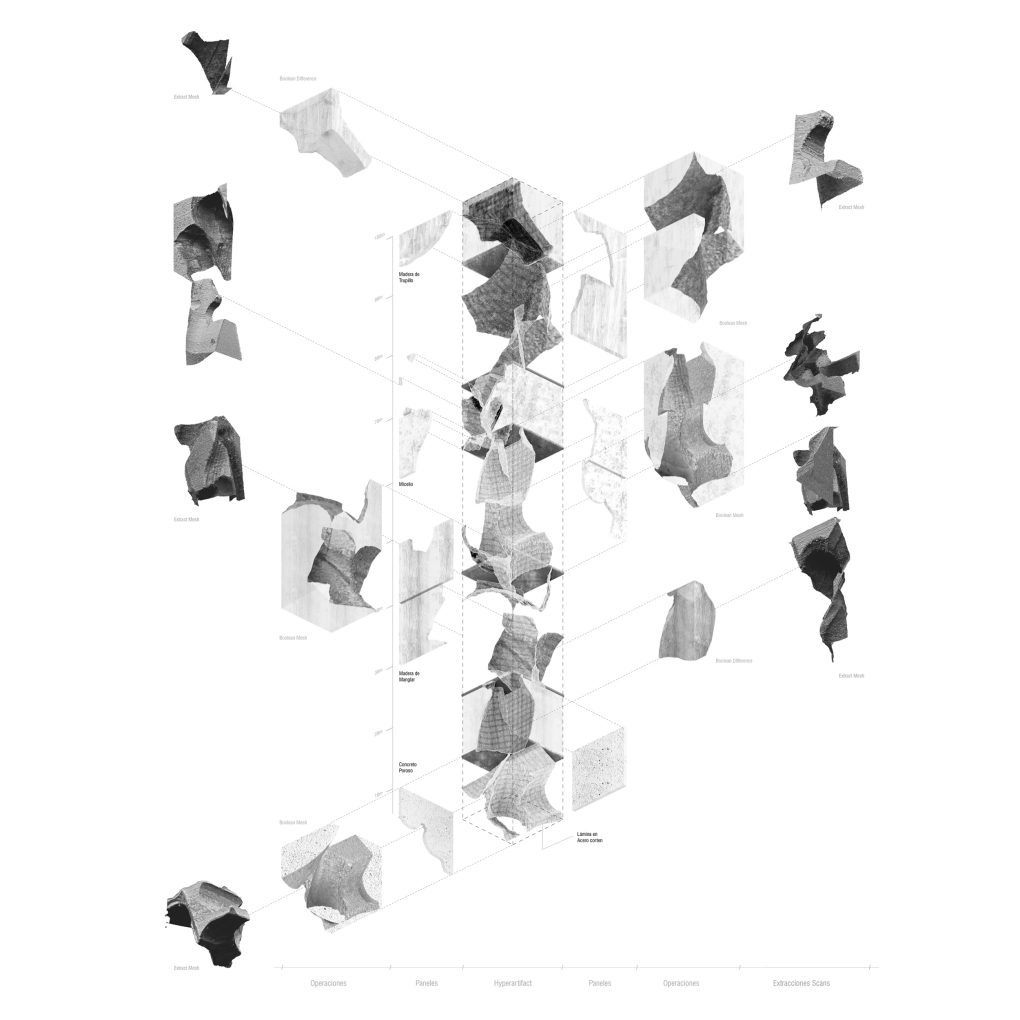 La exposición del artefacto a los vientos, los sedimentos salinos y las aguas de lluvia dicta el inicio de un proceso de descomposición. La pieza interior comienza a revelarse una vez los paneles empiezan a caer. Paneles que se convierten en ruina, y ruina que se convierte en mangle. Al tocar el suelo se deshacen en minerales que catalizan el mangle que una vez fue, y que ahora podrá volver a ser: un hipermangle que ahora responderá a sus límites naturales y a una frontera antrópica de sal.
