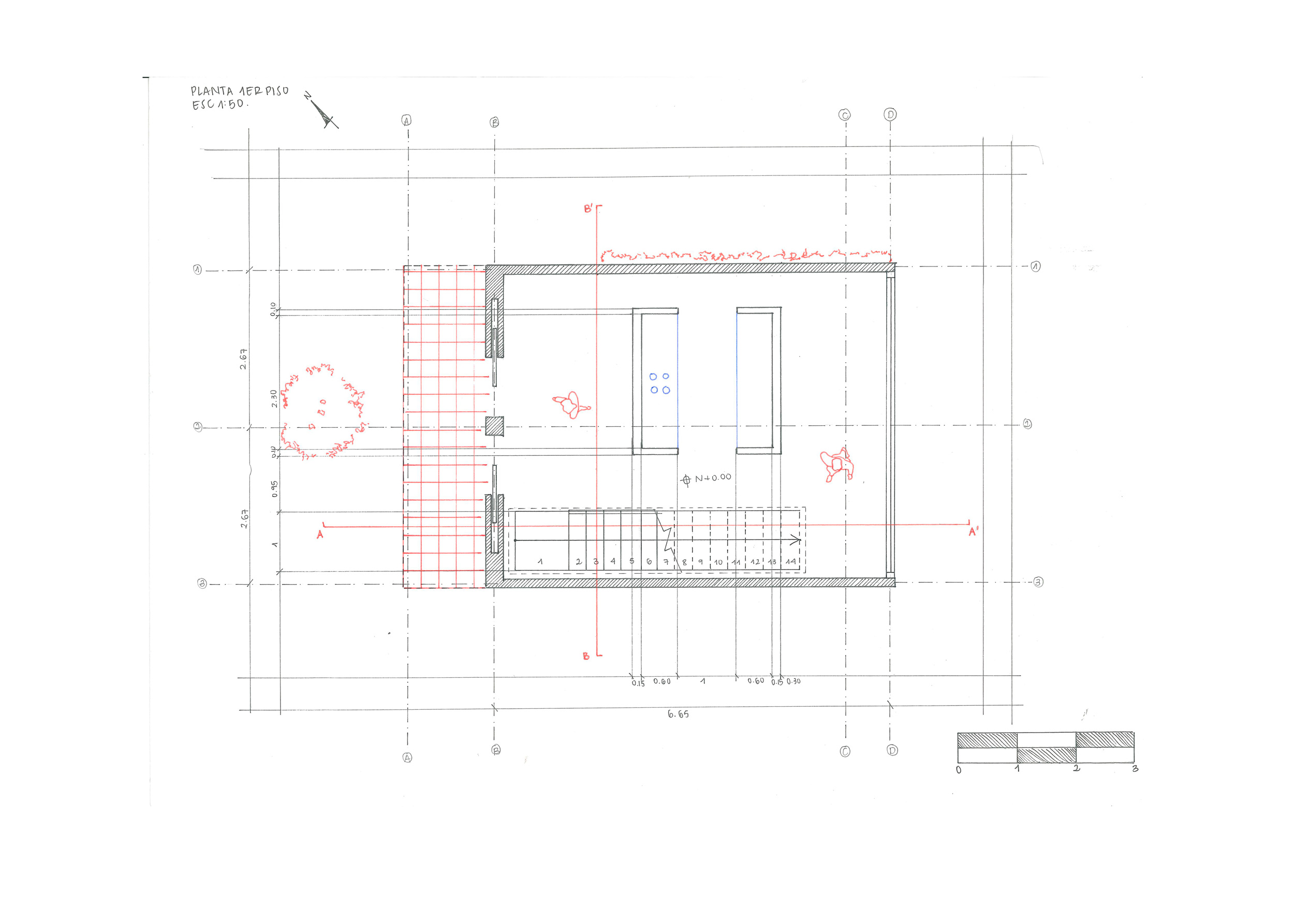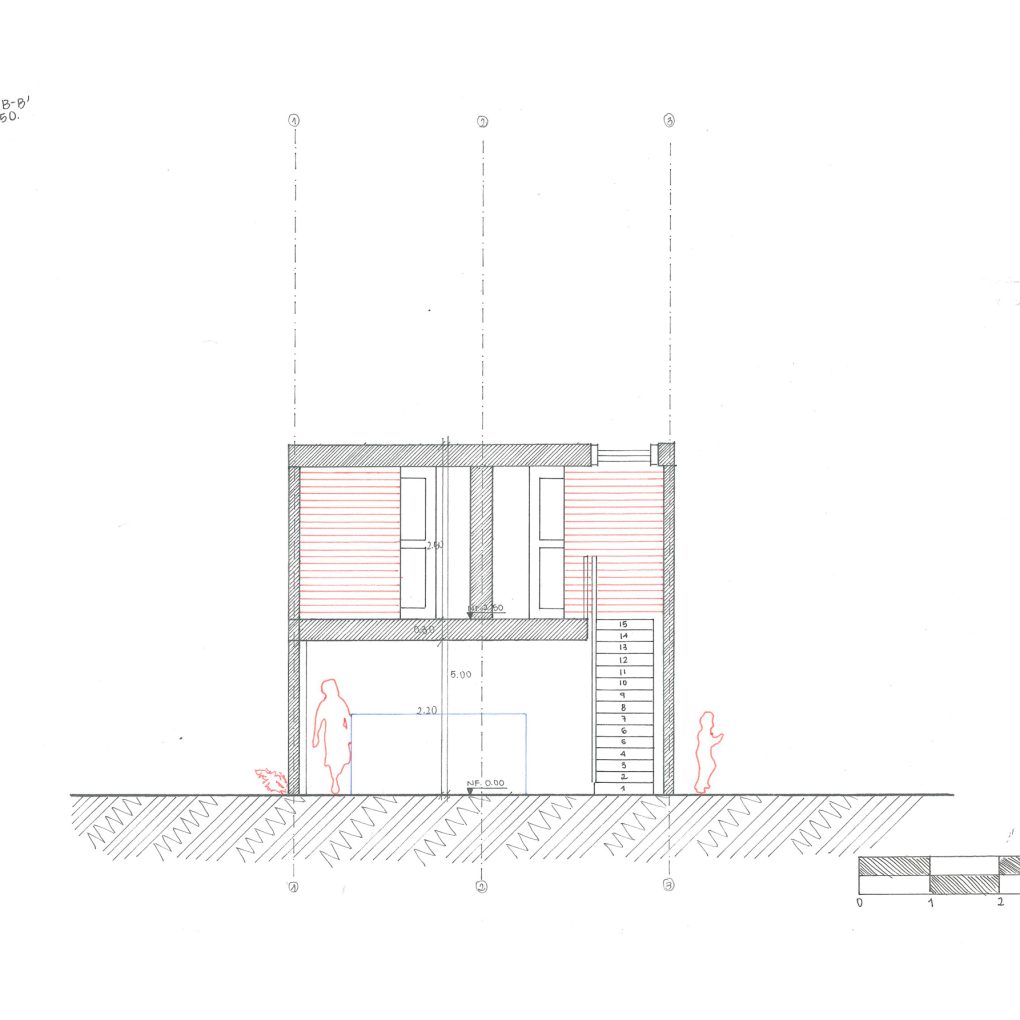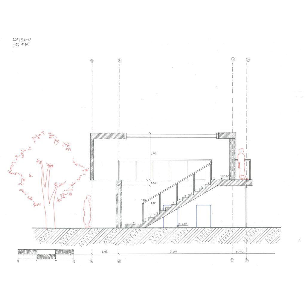 Se propuso un pabellón en donde se buscó jugar y sobreponer volúmenes de diferentes tamaños; lo anterior, con el fin de alterar ligeramente la simetría y generar aleros y balcones. Teniendo en cuenta el cuerpo del espacio, se manejaron alturas de 2,50 m por piso y se incluyeron diferentes elementos arquitectónicos, como una vidriera, un tragaluz, dos puertas empotradas, una escalera de un tramo y dos antepechos. Adicional a esto, se incorporó vegetación alrededor del pabellón y un mueble. Para mostrar el proyecto en su totalidad, se presentaron dos cortes, una planta del primer piso, una planta del segundo piso, una axonometría hecha con acuarelas, un fotomontaje, una planta de cubiertas, un corte de localización y, finalmente, un dibujo esquemático que muestra la idea global de la propuesta. Asimismo, se utilizaron los colores azul y rojo para resaltar los muebles del pabellón, la figura humana y la vegetación que arma el paisaje exterior.