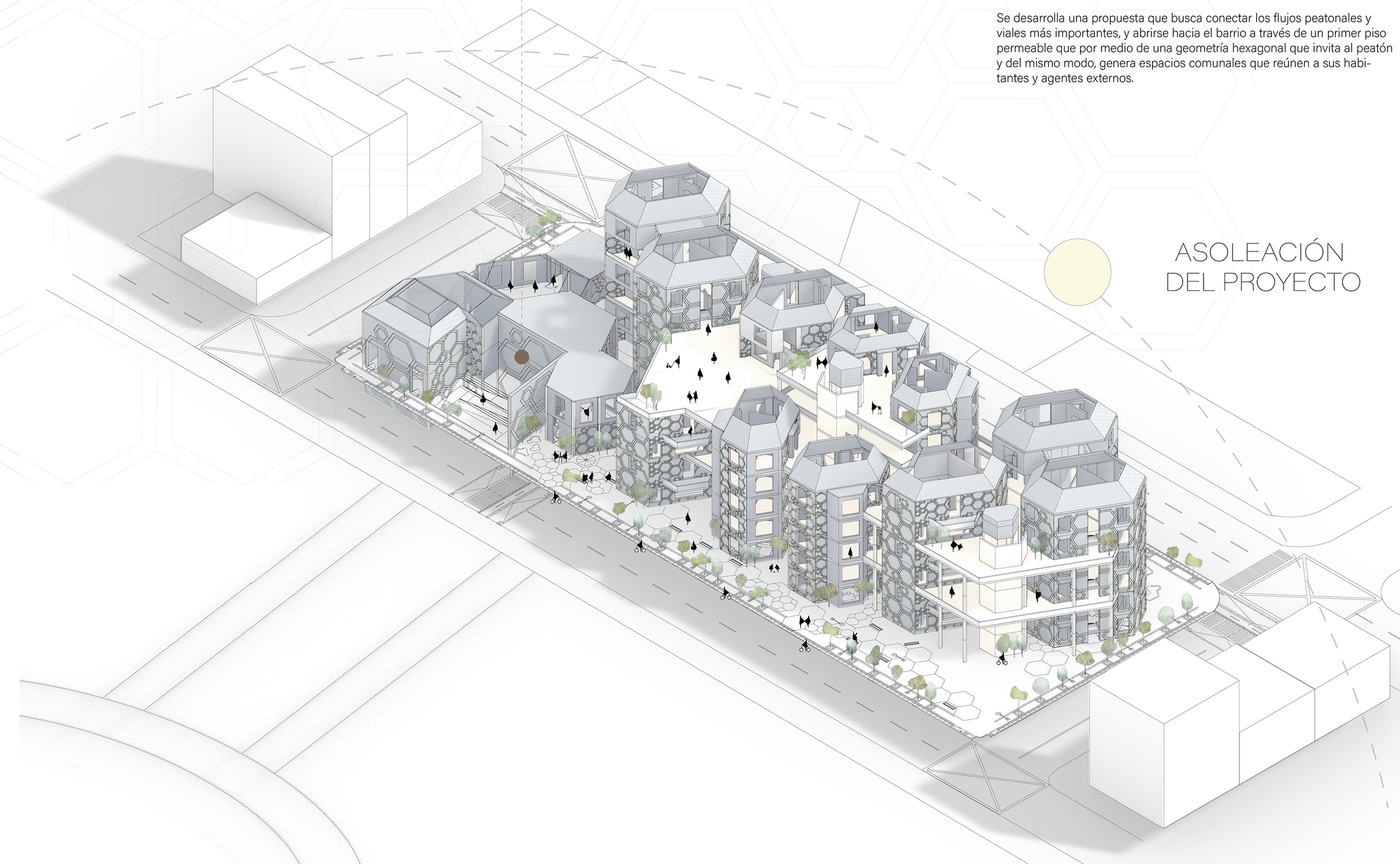 Se busca conectar una manzana de la ciudad con el fin de generar nuevas metodologías de vivienda en el primer piso a partir del pensamiento geométrico de los hexágonos como base del proyecto. Se desarrollan usos mixtos que permiten conexiones de flujos peatonales y una transición de la escala barrial a la escala urbana. Vivienda a la máquina busca establecer una relación intrínseca entre la necesidad de renovación urbana de un barrio en la ciudad y el cuidado sobre su historia, creando así una propuesta que permite integrar de forma armónica las partes en un todo que beneficie a la comunidad.