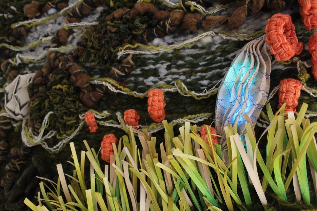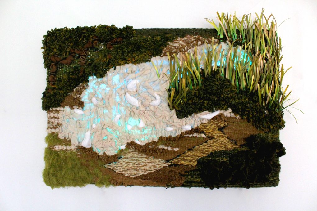 A lo largo de la ciudad, se encuentran escondidos los humedales de Bogotá, unos cuerpos de agua que tienen y dan vida; además, son recordatorios de los orígenes de la ciudad y nuestra cultura. Ellos son la inspiración del proyecto, donde descubrí estos espacios como agentes de paz y desconexión que conmemoran el pasado. Junto a Javier, mi maestro en el oficio de tejeduría, exploramos múltiples materiales y técnicas en el telar vertical, que combinados con elementos electrónicos nos permitieron reproducir la delicadeza y el detalle de la naturaleza con la artesanía, y transportar sensorialmente al humedal con lo digital. Todo esto, con el fin de mostrar mediante tapices algunas dinámicas existentes dentro del ecosistema, y reflexionar acerca de la forma en que nos relacionamos con los humedales y la importancia de cuidarlos.