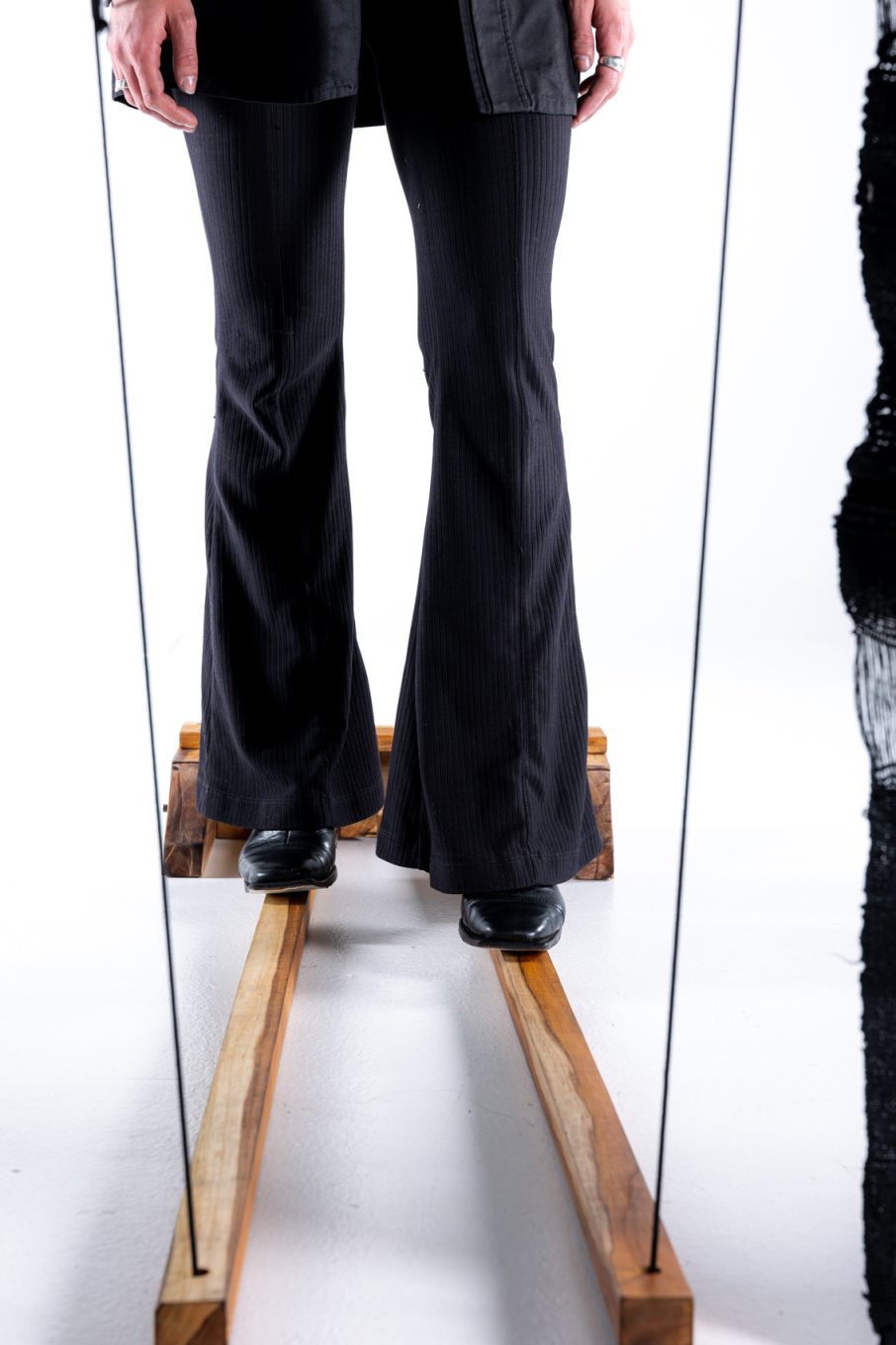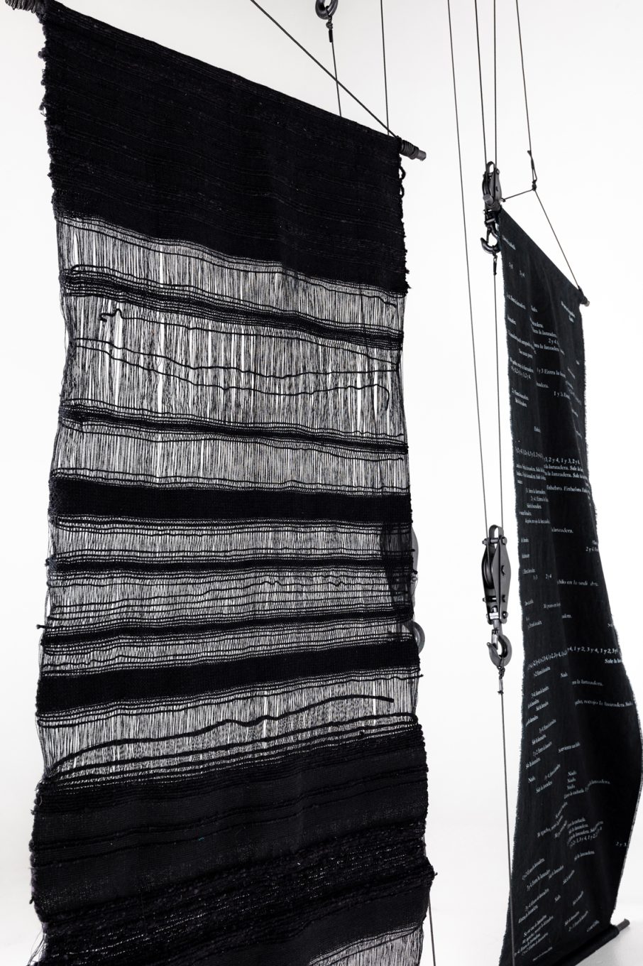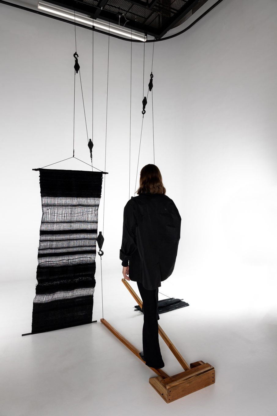 Al ritmo del paisaje sonoro construido a partir de la síntesis de los audios grabados durante cada uno de los encuentros que mantuve con el telar y las herramientas, el Metatextil habita el espacio acompañado del sonido de la lanzadera entrando y saliendo y de los marcos subiendo y bajando. La lógica que lo compone es totalmente textil: al pisar el pedal derecho participa el tejido que se produjo en una serie de encuentros entre el telar las herramientas y yo. Es la materialización que da cuenta del diálogo que mantuvimos. Por otro lado, el pedal izquierdo llamará al registro de los aprendizajes corporales que ahora me habitan y me convierten en tejedora.