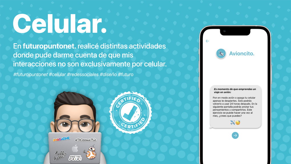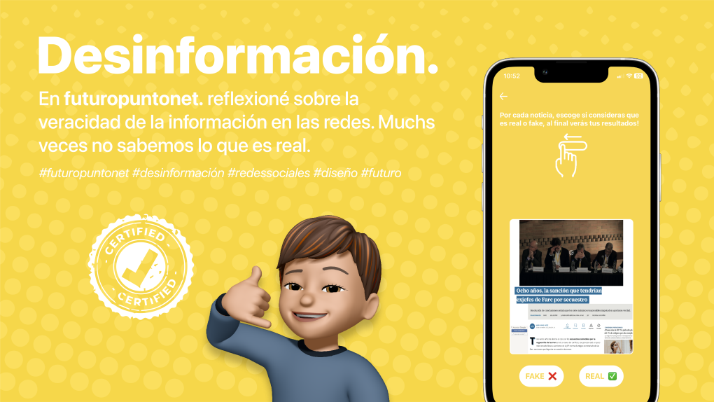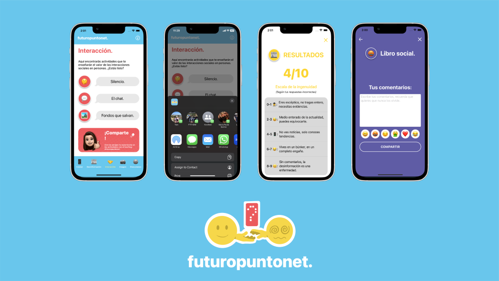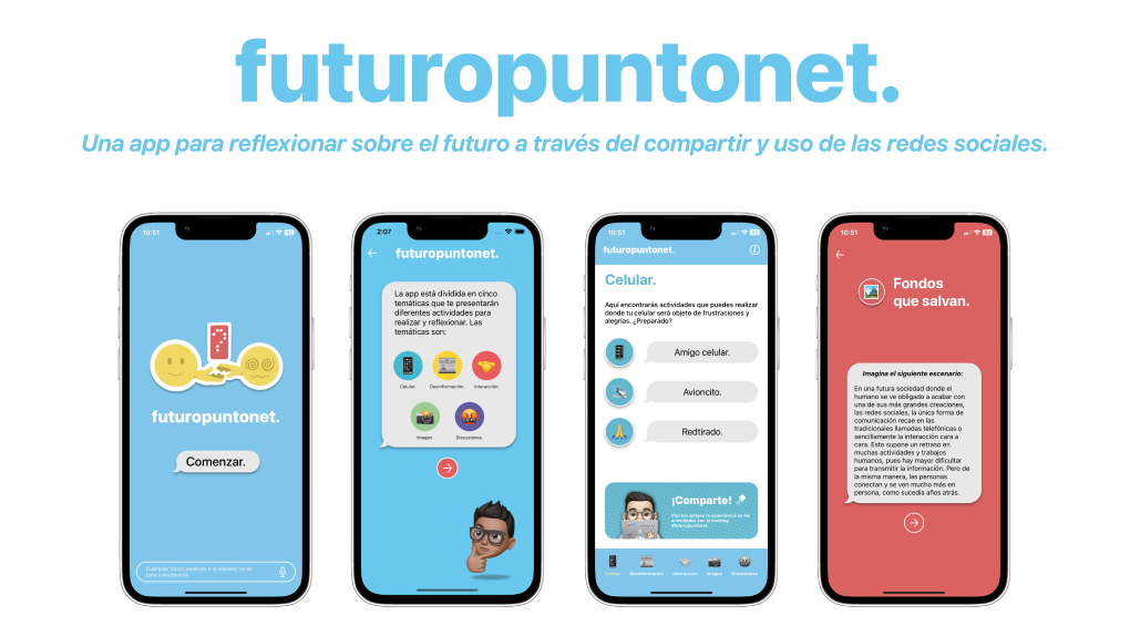 A través de este proyecto, exploro como el diseño y la tecnología pueden generar espacios de reflexión y cuestionamiento, con el propósito de detener la rutina diaria y pensar cómo nuestro presente, y sobre todo nuestro futuro, teje las dinámicas sociales en la red. A través de un proceso de investigación empírica e iterativa y de la aplicación del diseño especulativo, se desarrolló una aplicación móvil llamada Futuropuntonet, que plantea escenarios especulativos y actividades para reflexionar sobre el uso de la tecnología y redes sociales como Instagram y Facebook, que buscan permitir pensar el futuro de manera crítica y sensata.