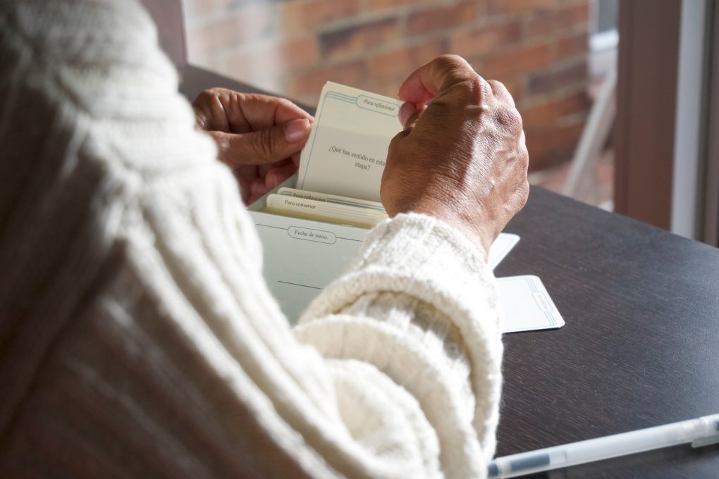 A través de tres juegos de cartas, se busca que los cuidadores tengan un incentivo y una guía para conversar, reflexionar y recordar. En respuesta al contenido de las tarjetas, los cuidadores, podrán guardar sus recuerdos, aquellos detalles íntimos del día a día con su ser querido, y volver a ellas a lo largo del camino.