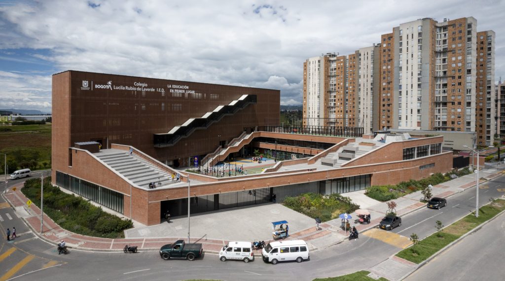 El proyecto es uno de los pocos colegios en altura que hay en Bogotá. Ante la dificultad de encontrar predios para construir colegios públicos y la alta demanda por cupos escolares, el Distrito emitió un decreto que permitió tener colegios de hasta de 6 pisos. Esto planteó el reto de diseñar un colegio en altura para 1.050 alumnos en un lote reducido con altos requerimientos de áreas libres. La respuesta fue usar una tipología de barra sobre una plataforma pública que paramenta la calle, genera un claustro y maximiza el espacio libre desdoblándolo hacia sus cubiertas.