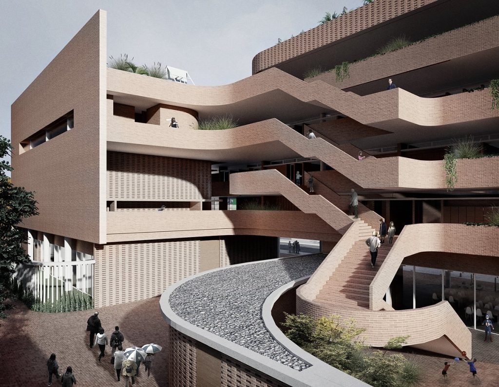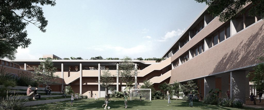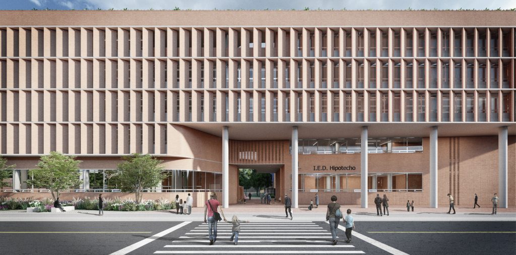 Entre los proyectos que expuso de su oficina, Carlos incluyó el Colegio Hipotecho, una propuesta que soluciona un programa complejo en altura y brinda servicios a comunidades vulnerables. Gracias a su participación en concursos públicos, AR-AR está diseñando en este momento varios proyectos de arquitectura educativa para Bogotá. Edificios públicos que funcionan como generadores de igualdad.