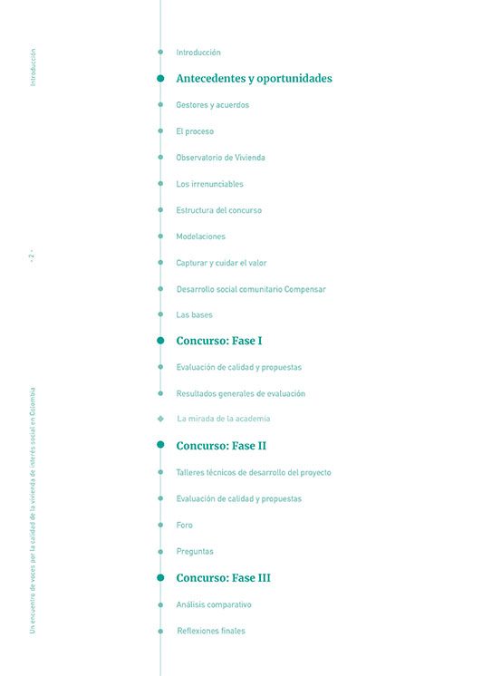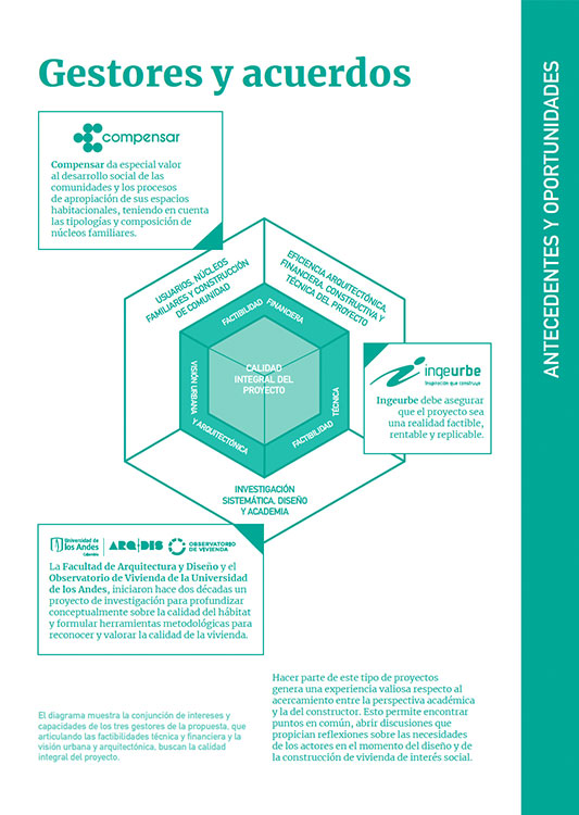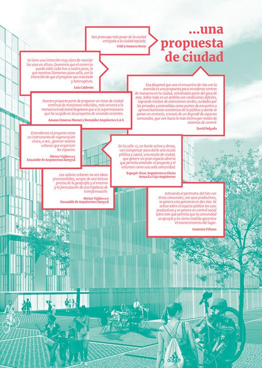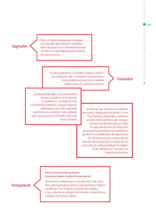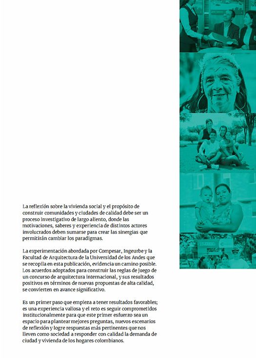 La experimentación abordada por Compesar, Ingeurbe y la Facultad de Arquitectura de la Universidad de los Andes que se recopila en esta publicación, evidencia un camino posible. Los acuerdos adoptados para construir las reglas de juego de un concurso de arquitectura internacional, y sus resultados positivos en términos de nuevas propuestas de alta calidad, se convierten en avance significativo.